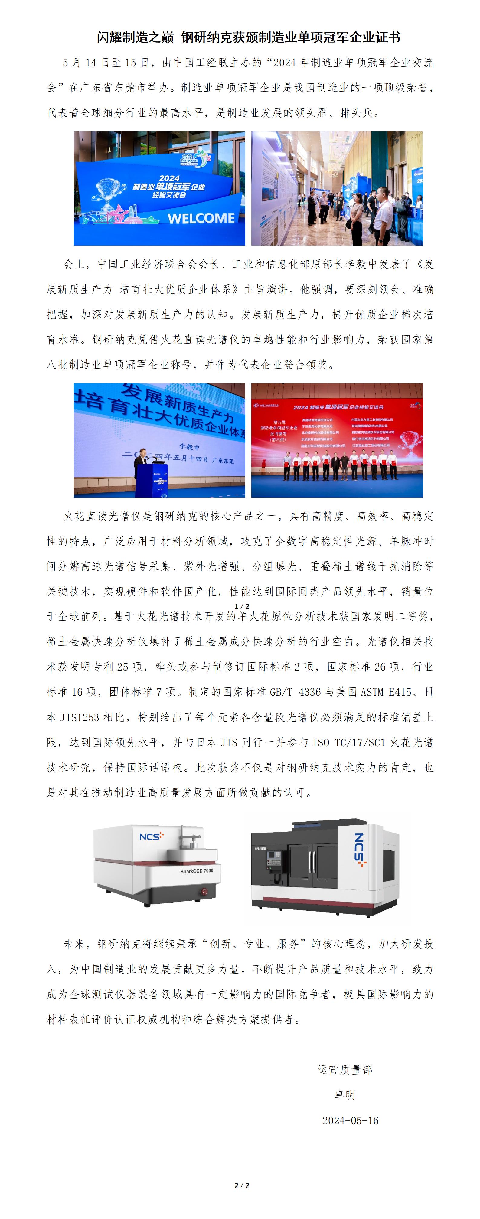 闪耀制造之巅 钢研纳克获颁制造业单项冠军企业证书 分享: